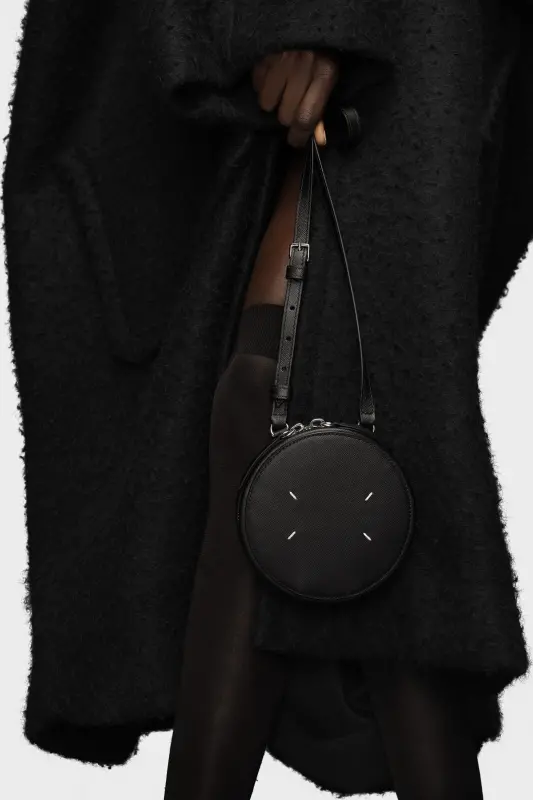 With an adjustable shoulder strap, the mini circular bag comes in calf leather with metallic hardware detailing and an inside mirror. Maison Margiela’s signature Four stitches appear on the front; the opposite of a label.