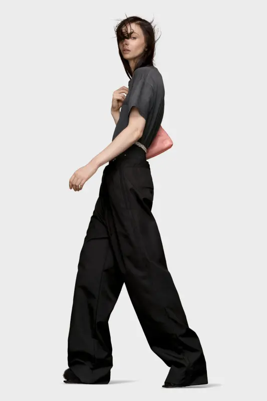 The oversized pleated trousers come in cordura with a waist tie, pockets and buttons at the back for braces. Maison Margiela’s signature, the Four stitches, appear at the back; the opposite of a label.
