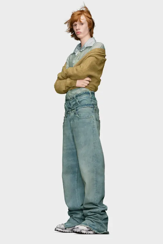In distressed denim for a lived-in look, the straight-leg jeans feature a buckle at the back for an adjustable fit. They have classic five-pocket styling, belt loops and the Margiela hook closure. Frayed edges further the theme. Maison Margiela's signature, the four stitches, appear at the back; the opposite of a label.