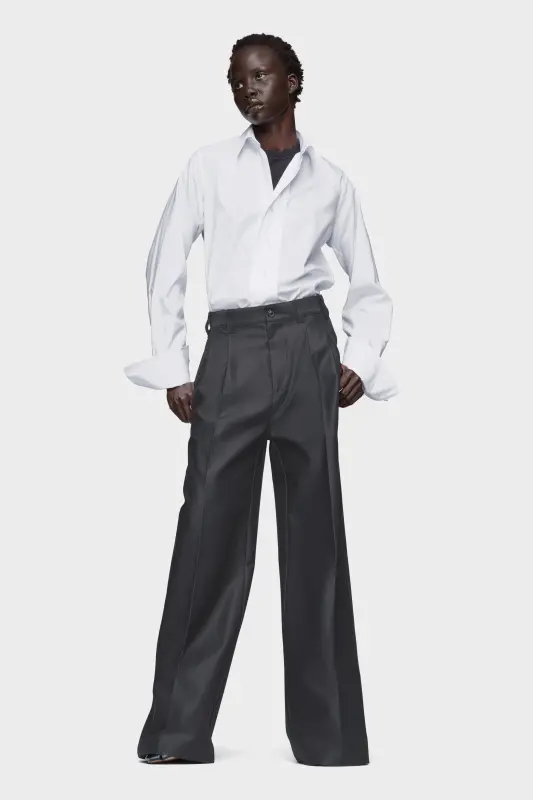 This cotton shirt plays with proportion, cutting a clean silhouette from classic elements: sharp collar, oversized cuffs, and a curved hem. Familiar components, restructured. At the back, the Maison’s signature four stitches appear; the opposite of a label.