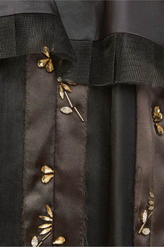 Crafted from silk, the dress features spaghetti straps with a sculpted bodice and contrasting straight skirt, disrupted around the middle with a pleated ruffle with lace trim. The Maison’s Décortiqué technique is explored throughout, lending an undone aesthetic. Floral glass beading adorns the panels down the skirt with distressed details to add contrast to the finery. The numeric logo appears on a label at the back as if stitched inside-out.