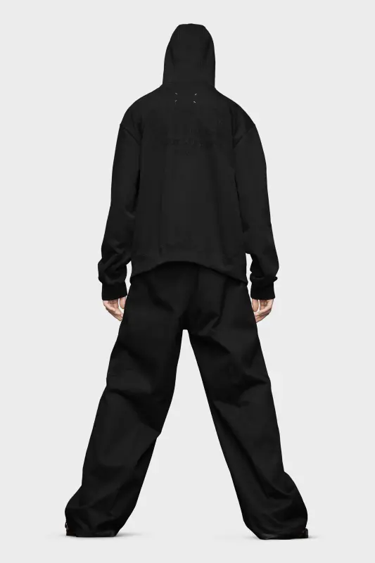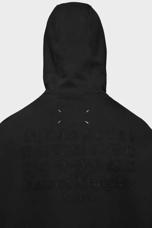 The hooded sweatshirt comes in firm cotton fleece with a zip closure and split kangaroo pocket at the front. The back features tonal Maison Margiela reverse embroidery. Maison Margiela's signature, the Four stitches, also appear at the back; the opposite of a label.