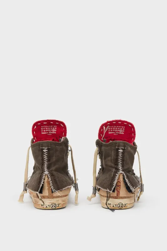 A symbol of impermanence and identity, these Love to Death sneakers are crafted in layered canvas, sliced and frayed to reveal traces of wear. The design distorts classic construction with exposed stitching, distressed edges, and a handmade effect across every panel. A tactile manifestation of memory in motion.