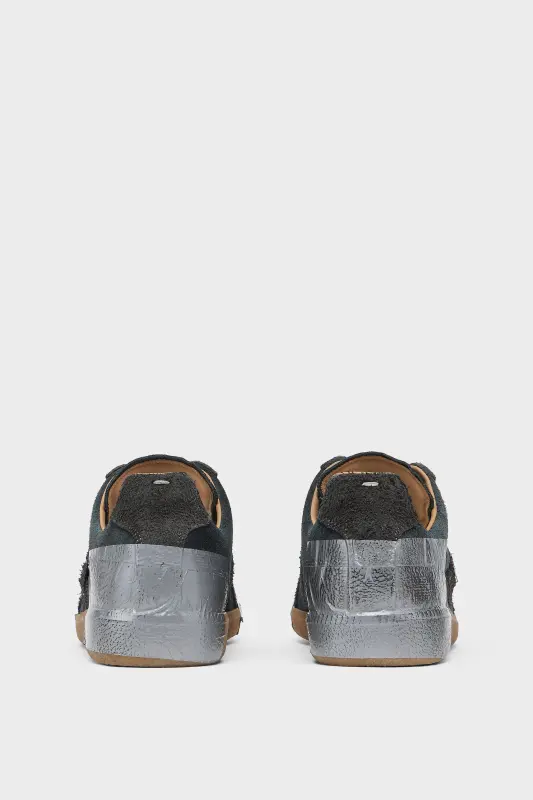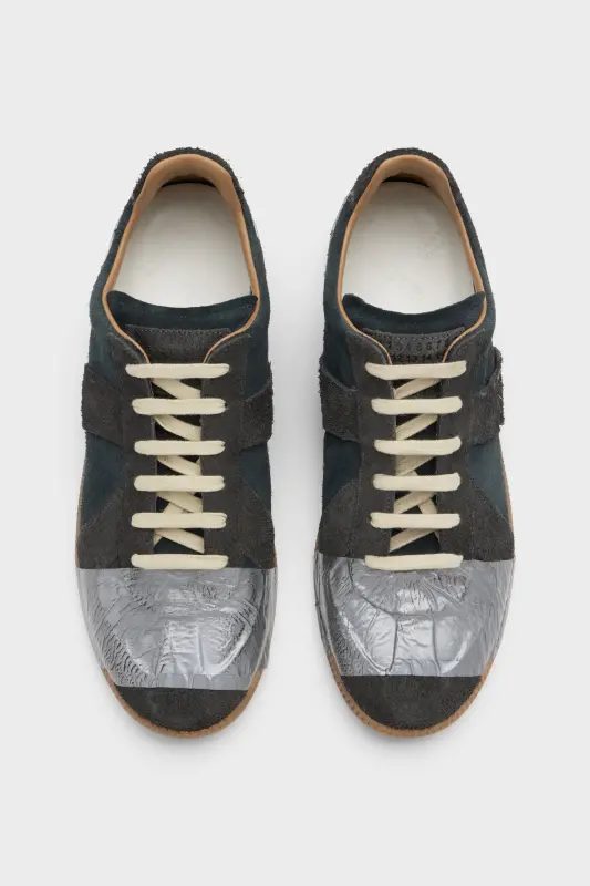 The Replica sneakers in hairy suede with a honey sole. This season reinterpreted with tape detailing, a nod to the used and repaired house code. The Maison's iconic Replica sneakers are inspired by Austrian sports shoes from the seventies. Details on the Replica pairs are continually reworked in line with the season's inspirations. Maison Margiela's signature single white stitch appears at the back.