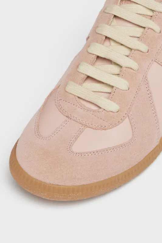 The Replica sneakers in nappa leather and suede with a honey sole. The Maison's iconic Replica sneakers are inspired by Austrian sports shoes from the seventies. Details on the Replica pairs are continually reworked in line with the season's inspirations.
