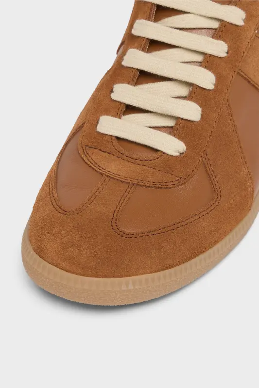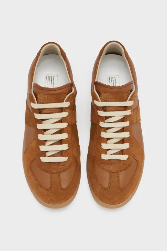 The Replica sneakers in nappa leather and suede with a honey sole. The Maison's iconic Replica sneakers are inspired by Austrian sports shoes from the seventies. Details on the Replica pairs are continually reworked in line with the season's inspirations.
