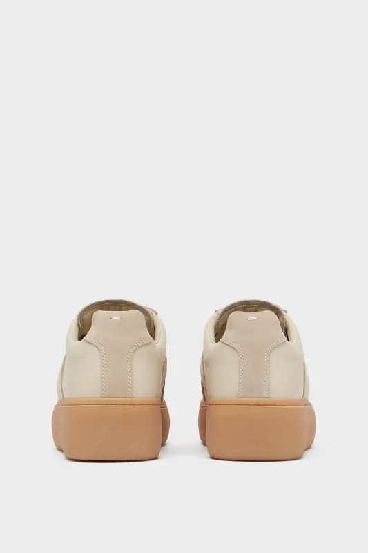 The Replica sneakers in nappa leather and suede with a honey sole finished on a platform wedge. The Maison's iconic Replica sneakers are inspired by Austrian sports shoes from the seventies. Details on the Replica pairs are continually reworked in line with the season's inspirations.
