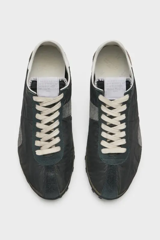 The sprinters are refreshed with the season's foil treatment. The sneaker recalls 1960s spike shoes, crafted in Nylon and tonal suede panels, treated for a distressed effect. The cleated sole includes numeric detailing, with 22 circled to indicate the footwear collection. The tongue bears the numeric logo, while Maison Margiela's signature single white stitch appears at the back.
