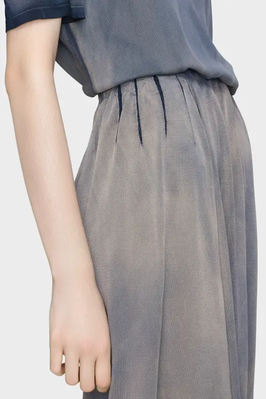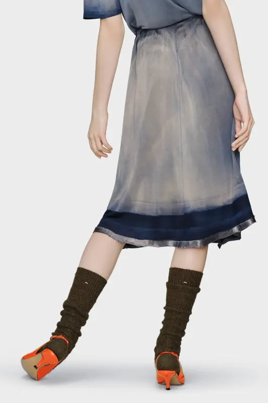 Drawing from real workwear pieces, this skirt is finished with a vintage wash that mimics the patina of sun exposure. A softly gathered silhouette and raw edges reference the Maison’s Memory of the Hem technique, highlighting traces of past construction. Maison Margiela’s signature, the four stitches, appear at the back; the opposite of a label.