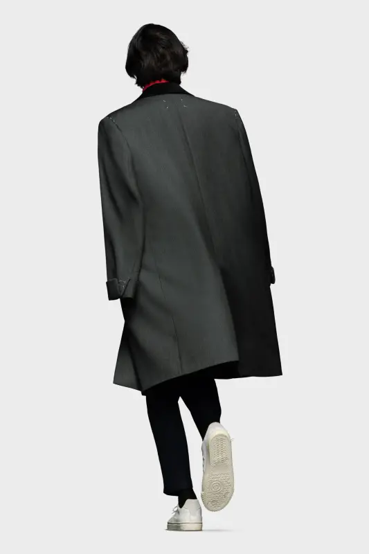 The wool coat features the Maison's work-in-progress stitch details at the shoulders with asymmetric flap pockets and a hidden buttoned placket for a clean aspect. It features a contrast collar and sleeves that can be rolled up to showcase the lining. Margiela's signature, the four stitches, appear at the back; the opposite of a label.
